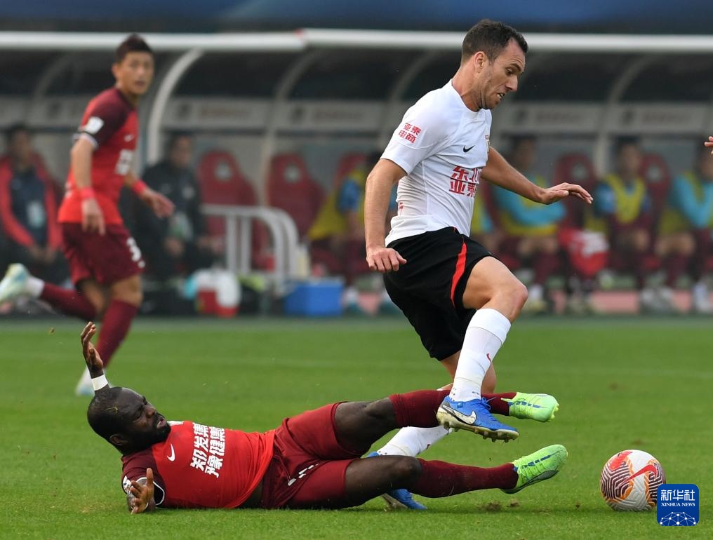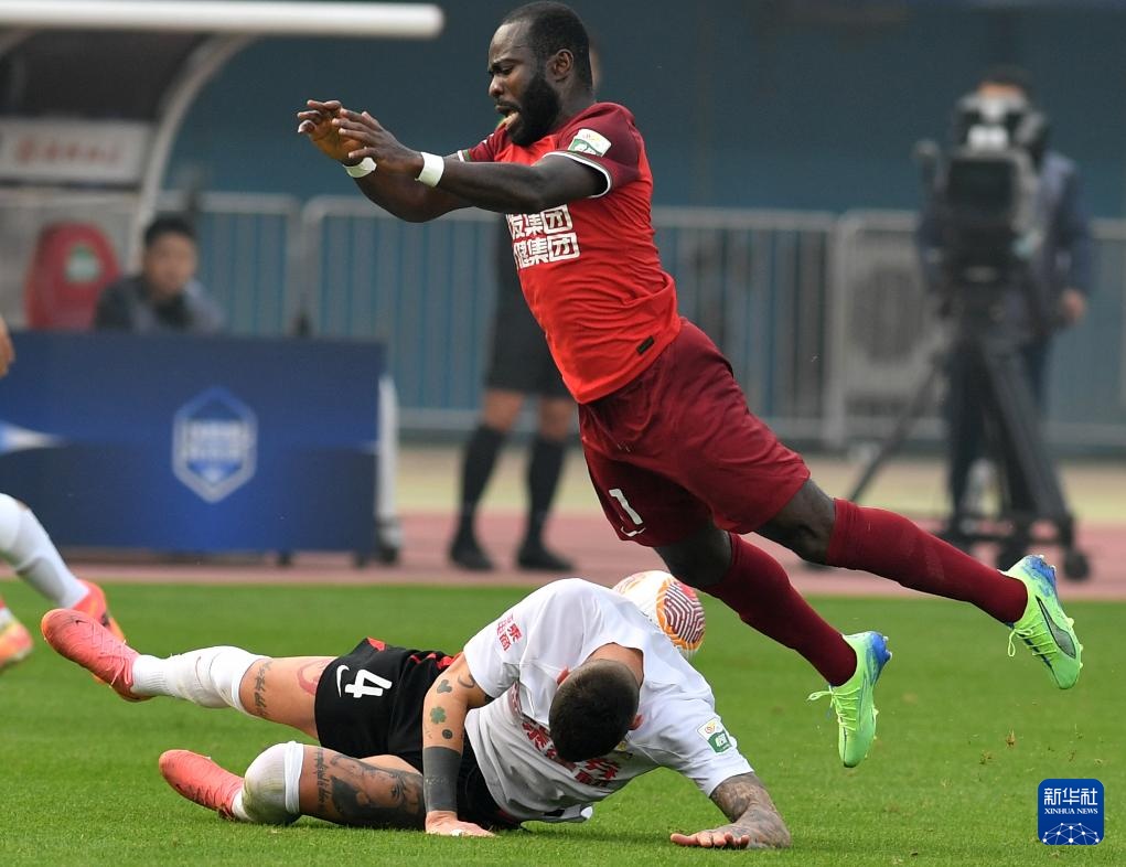 27日10月,长春亚泰队球员塞尔吉尼奥(右)正在角逐中拼抢河南俱笑部酒祖杜康队球员阿奇姆彭(下)与。