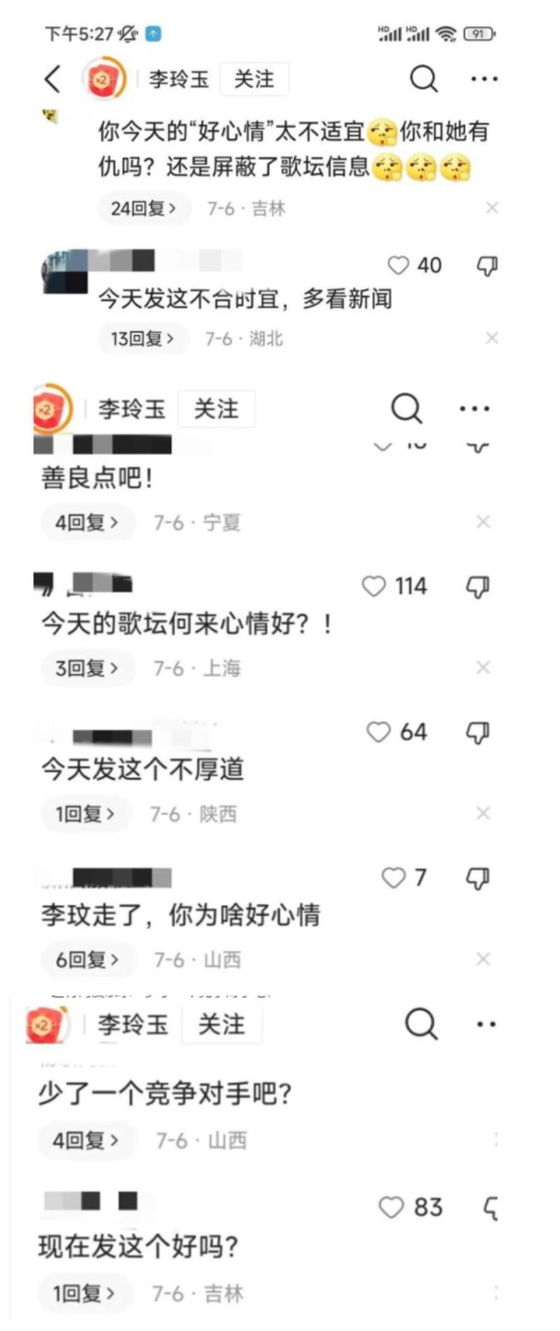 9日7月,声澄清争议李玲玉发,玟并不睬解称我方和李,她的粉丝也并非,的几首歌曲但也笃爱她,交平台上只是正在社,平素里的存在形态颁布了极少我方,我方的事做适合,己的存在过适合自,疑者:“心坎别那么阴重奈何就不成?并喊话质!不成吗?阳光一点!”