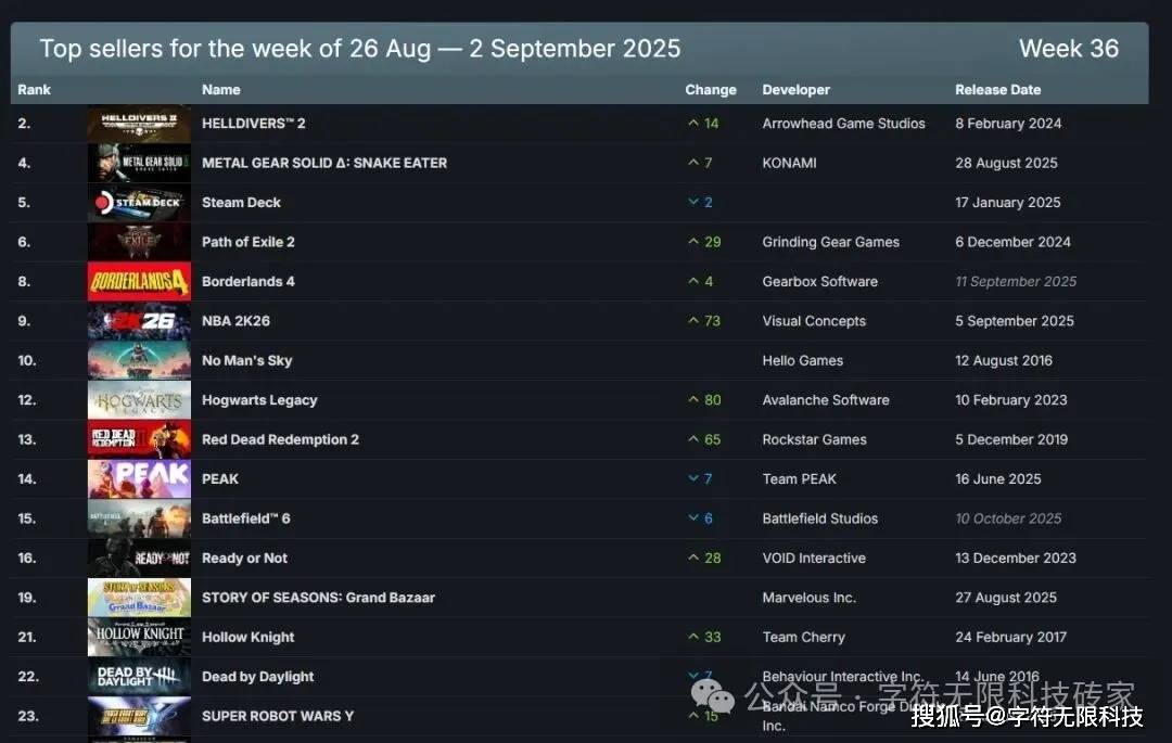 出炉(2025年8月26日-2025年9月2日Steam 2025年最新一漫游戏销量排行榜,游戏)无免费。